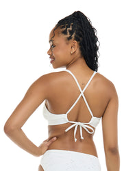 Our Sarah top is sweet, stylish, and supportive. This fixed triangle piece, available in cup sizes D to F, was designed with your comfort in mind: two-way tie back and removable soft cups are perfect for bustier figures. For a dash of darling detail, look no further than Sarah’s dual shoulder straps and front ruching!
