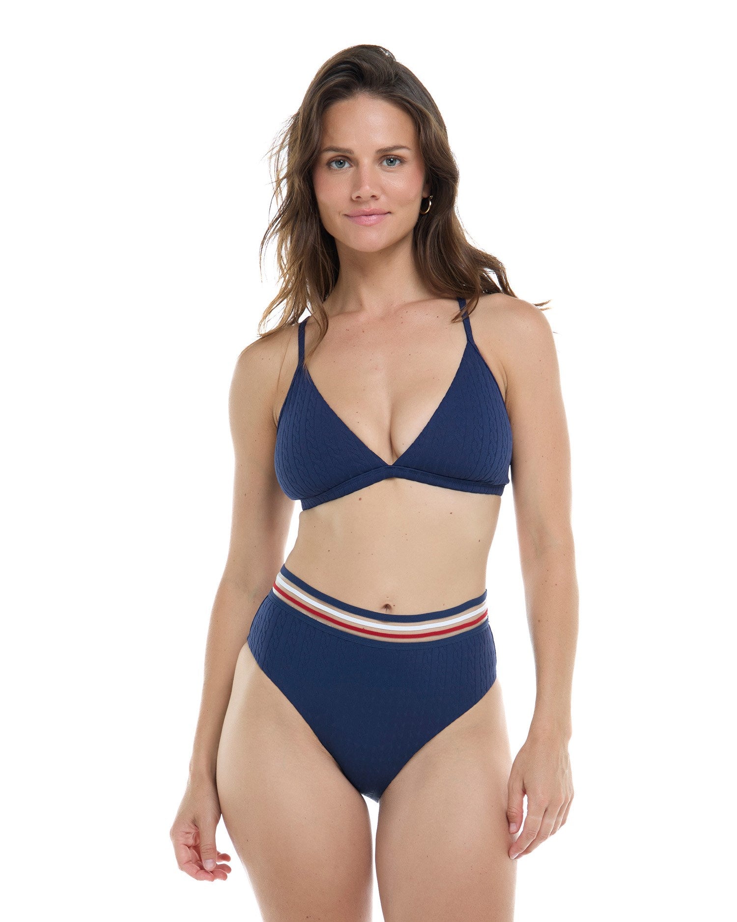 Inspired by the timeless allure of the sea, Marina features a navy blue braided texture that adds depth and dimension, evoking the effortless sophistication of classic maritime style. The striking red and white waistband details provide a bold contrast, infusing the design with a sporty, nautical edge. Perfect for sun-drenched days by the water, Marina is a must-have for those who love a touch of coastal elegance in their swimwear collection.