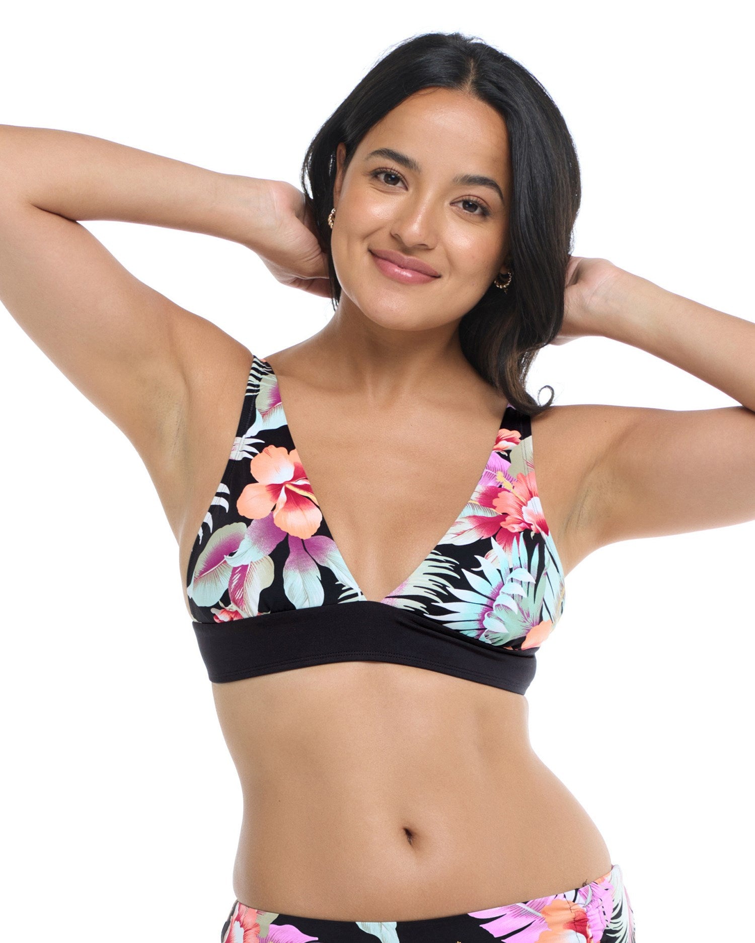 Flirting with the idea of spicing up your swim drawer? This romantic floral print is sure to sweep you off your feet. Set against an inky black background, a tangle of hibiscus blooms and luxurious leaves shows off its vintage-inspired color palette. Look closely and you’ll notice each petal seems to glow, as though the moon – hidden just out of view – was bathing it in soft light. Slip into our Flirtation collection and feel its lush vibes wash over you.
